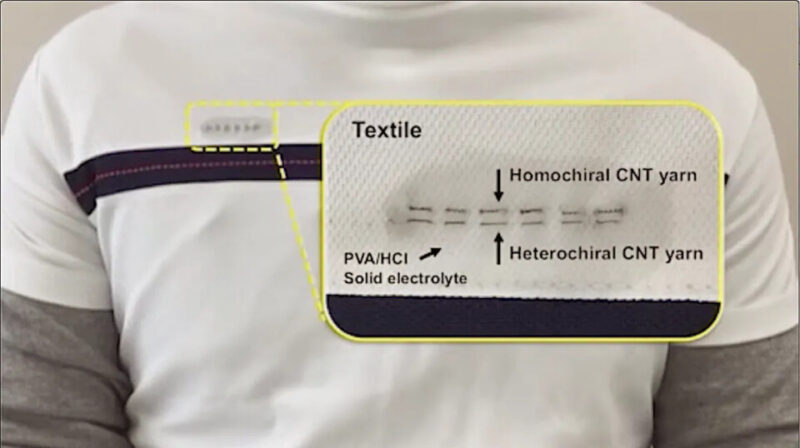 2016 yılında Atlanta'daki Georgia Teknoloji Enstitüsü'nden araştırmacılar, hem güneş ışığından hem de hareketten enerji toplayan bir kumaş yarattı. Kumaşı yapmak için ekip, fiber bazlı triboelektrik nanojeneratörlere sahip hafif polimer liflerden yapılmış yün ipliklerini, güneş pillerini bir araya getirir. dönme, kayma veya titreşim gibi mekanik hareketlerden az miktarda elektrik gücü üretir. Kumaş 320 mikrometre kalınlığında ve oldukça esnek, nefes alabilir ve hafiftir. Ekip bir gün olabileceğini öngörüyor çadırlara, perdelere ve hatta kıyafetlere entegre edilmiştir.