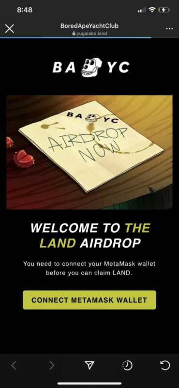 İşte Olanlar: BAYC'nin hesabı saldırıya uğradıktan sonra, saldırganlar bir airdrop yoluyla projenin metaverse'inde arazi talep etme konusunda bir mesaj yayınladılar. İnsanlardan, araziyi talep etmek için Matemask cüzdanlarını (veya başka herhangi bir eşdeğer kripto para birimi cüzdanını) bağlamalarını istedi.