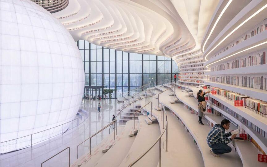 Binhai Kültür Bölgesinde yer alan Tianjin, Hollandalı tasarım firması MVRDV tarafından Tianjin Kentsel Planlama ve Tasarım Enstitüsü (TUPDI) işbirliği içinde tasarlanan ve o zamandan beri "Binhai'nin Gözü" olarak adlandırılan beş katlı kütüphane, 34.000 metre kareyi kapsıyor ve 1,2 milyon kitap tutabiliyor. Tamamlanması sadece üç yıl süren kütüphanede zemin katta bir okuma alanı, orta bölümlerde ve ofislerde salon alanları, toplantı alanları ve üstte bilgisayar/ses odaları bulunmaktadır.