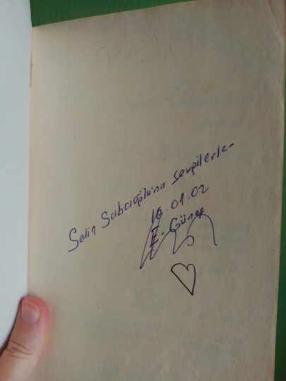 Görüntü iyi değil, biliyorum. Ama ilkokuldayken yakın bir arkadaşıma vermiştim. Kitap döndüğünde bu haldeydi. Kitap bu hale gelince çok üzülmüştüm ve bu olaydan sonra kimseye kitap vermedim. Adımı ve soyadımı ben yazdım ve Ekrem bey imzaladı. Tam iki kitap heder oldu. Ama tek bir kötü söz etmedi. Bu anı beni derinden etkilediği için kitabın durumuna rağmen imzasını da paylaşmak istedim. Görsel için özür dilerim.