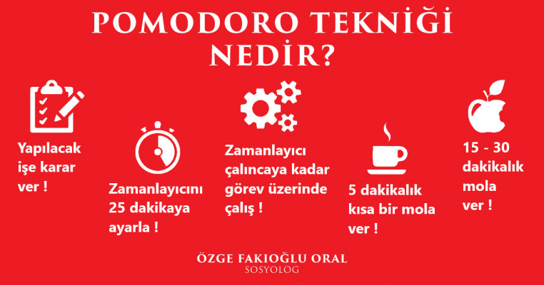 Pomodoro Tekniği, 1980'lerin sonunda Francesco Cirillo arafından geliştirilen bir zaman yönetimi yöntemidir. Pomodoro tekniği, planlı molalarla odaklanmış çalışma için basit ama etkili bir araçtır. Francesco Cirillo, 1980'lerin sonlarında, üniversite öğrencisiyken kullandığı domates şeklindeki zamanlayıcıdan sonra, domates anlamına gelen "pomodoro" terimini ortaya attı. Peki, nasıl çalışır? Bir pomodoro aralığını adım adım inceleyelim: