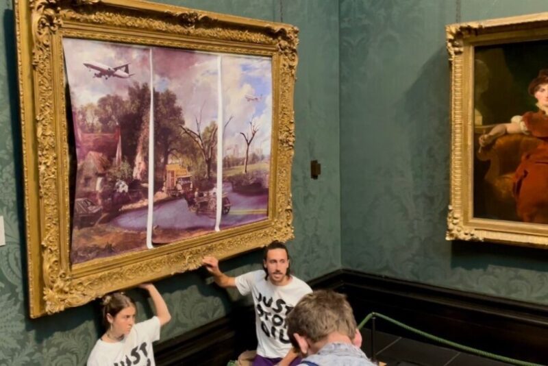 Aynı çevreci grup mensuplarından Hannah Hunt ve Eben Lazarus adlı iki kişi de geçen ay, John Constable’ın 1821 tarihli “The Hay Wain” (Saman Arabası) tablosuna ellerini yapıştırmıştı. Aktivistler esere zarar vermemek için kendilerince bir önlem almış; orijinal tablonun üzerini “Geleceğin Kıyamet Vizyonu” adını verdikleri başka bir resimle kaplamıştı.