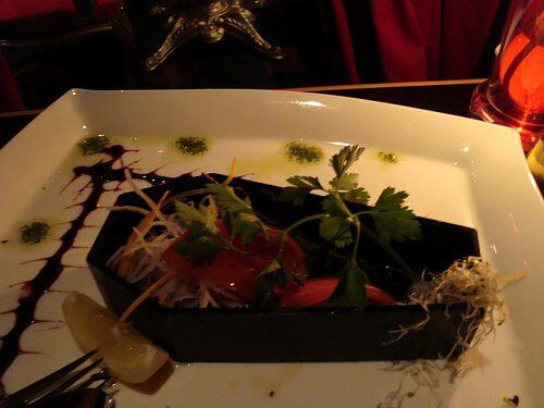 Bir başka yemek servis tabağında da tabut şeklinde bir sunum yapıldığını görüyoruz. Gotik ve vampir motiflerine ait her bir parça yemeklerde kullanılmaya özen gösterilmiş ve ortaya bu sanat eseri gibi sunumlar çıkmış.Tadının da tıpkı görüntüsü gibi muhteşem olduğunu söyleyen müşteriler var. Henüz yeni yeni denenmeye başlayan bir konsept için oldukça başarılı bir sunum olduğunu söyleyebilirim.