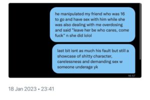 “16 yaşındaki arkadaşımı, benim aşırı doz almamla uğraşırken onunla ilişkiye girmesi için kandırdı. “Kendi haline bırak, kimin umurunda? Gel, ilişkiye girelim,” dedi ve arkadaşım da gitti.