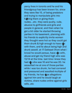 "Percy Toronto'da yaşıyor ve aşağı yukarı 15 yaşlarından beri o ve arkadaş grubunun “avcı” olmaları, kızları ilişkiye girmeleri ve çıplak fotoğraflar göndermeleri için kandırmalarıyla biliniyorlar. Kız arkadaşlarına, kızlara ve genel olarak insanlara baskıcı, kaba ve tacizci hareketler sergiliyorlardı. Biraz büyüdükten sonra bodrum katında arkadaşlarıyla birlikte, kendilerinin seksi olduklarını düşünüp, kızları kendileriyle ilişkiye girecek kadar sarhoş etmeyi planladıkları partiler düzenlemeye başladılar. Ayrıca kendilerinin de sarhoş oldukları hakkında yalan söylüyorlardı. (Bildiğim kadarıyla) en az 17-20 yaşlarındayken, o zamanlar 13/14 yaşlarında olan arkadaşımın peşine düşüp, sarhoş ederek ilişkiye girerdi. En son ilişkiye girdiklerinde arkadaşım 16, Percy ise 20 yaşındaydı. Ben çok sarhoşken, o partilerden birinde bana da saldırdı. Birçok arkadaşımı köşeye sıkıştırdı, baskı kurdu ve saldırdı. Hakkında tecavüz iddiaları var ve kurbanlarına gülüp, rızaları olmadan kızların çıplak fotoğraflarını internette yayınlardı.”
