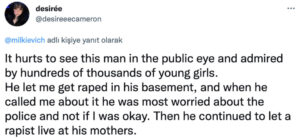 “Bu adamın halkın gözü önünde, birçok genç kız tarafından sevildiğini görmek çok acı verici. Bodrum katında tecavüz edilmeme izin verdi ve bu konuda beni aradığında, iyi olup olmadığımla ilgilenmekten çok polis için endişelendi. Sonrasında ise bir tecavüzcüyü annesinin evinde yaşatmaya devam etti.”