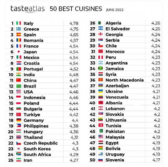 Taste Atlas'ın açıklamasına göre liste, kullanıcıların söz konusu olduğu ülkelerdeki "30 en iyi tabak, içecek ve yiyeceğe verdiği ortalama puanlara" dayanarak hazırlandı. Yeterli sayıda yemeği puanlandırılmayan ülkeler listede yer almadı.